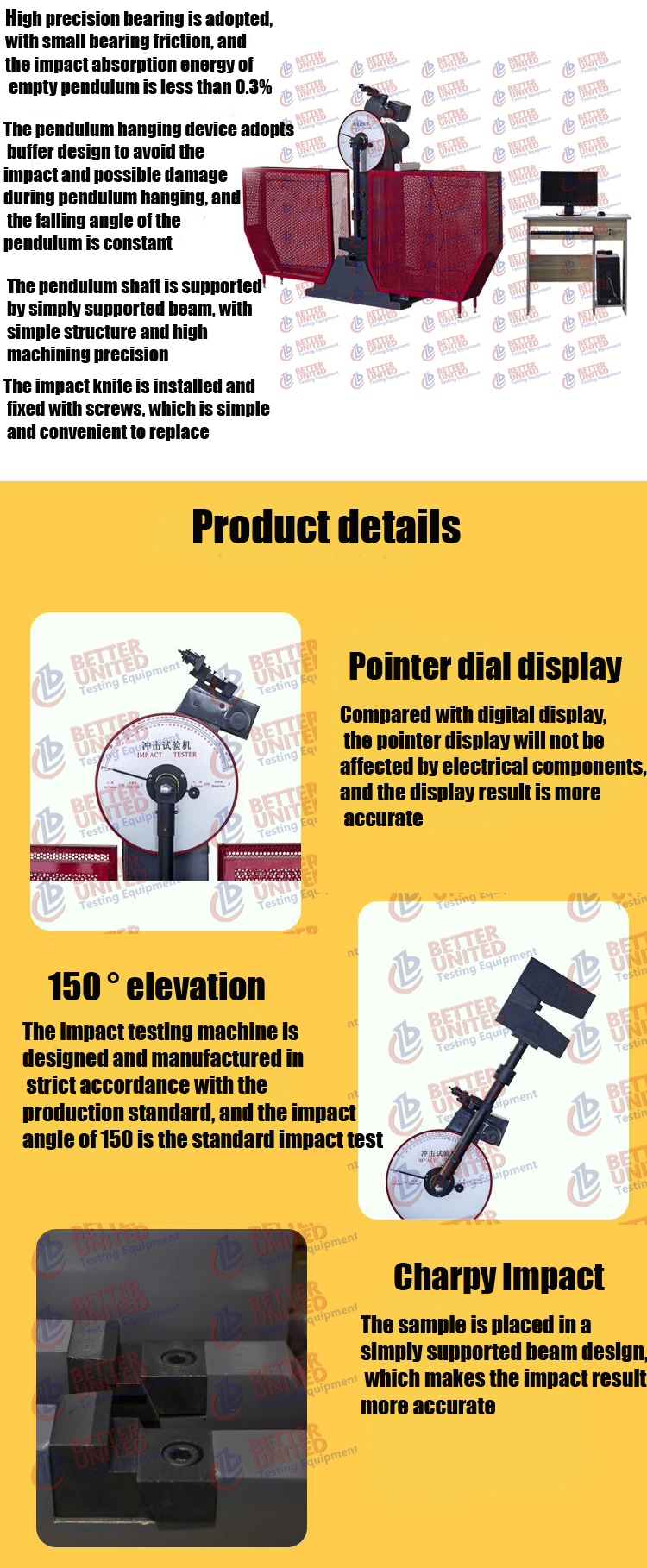 This impact tester is an instrument for testing the impact resistance of metal materials under dynamic loads. It can continuously conduct a large number of metal impact tests. It adopts full automatic control. The control system uses programmable logic controller (PLC) to control the whole process of swing taking and impact test through computer software program. Show the impact absorbing power, the rotation angle of the pendulum and print the test report. By equipping cryogenic tank, the test can be carried out at room temperature to - 60 degrees. It is an indispensable test instrument for metallurgical, mechanical manufacturing and other units, as well as for the research of new materials in scientific research units.Universal Testing Equipment